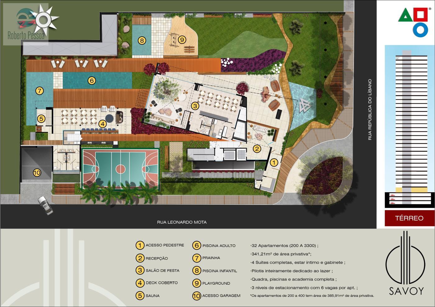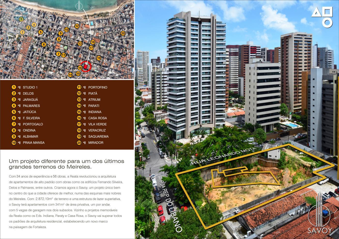 Um projeto diferente para um dos últimos grandes terrenos do Meireles. Com 34 anos de experiência e 56 obras, a Reata revolucionou a arquitetura de apartamentos de alto padrão com obras como os edifícios Fernando Silveira, Delos e Palmares, entre outros. Criamos agora o Savoy, um projeto único bem no centro do que a cidade oferece de melhor, numa das esquinas mais nobres do Meireles. Com 2.872,10m2 de terreno e uma estrutura de lazer superlativa, o Savoy terá apartamentos com 341m2 de área privativa, um por andar, com 5 vagas de garagem nos dois subsolos. Vizinho a projetos memoráveis da Reata como os Eds. Indiana, Paraty e Casa Rosa, o Savoy vai superar todos os padrões de arquitetura residencial, estabelecendo um novo marco na paisagem de Fortaleza.